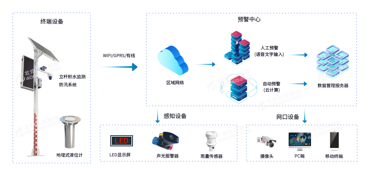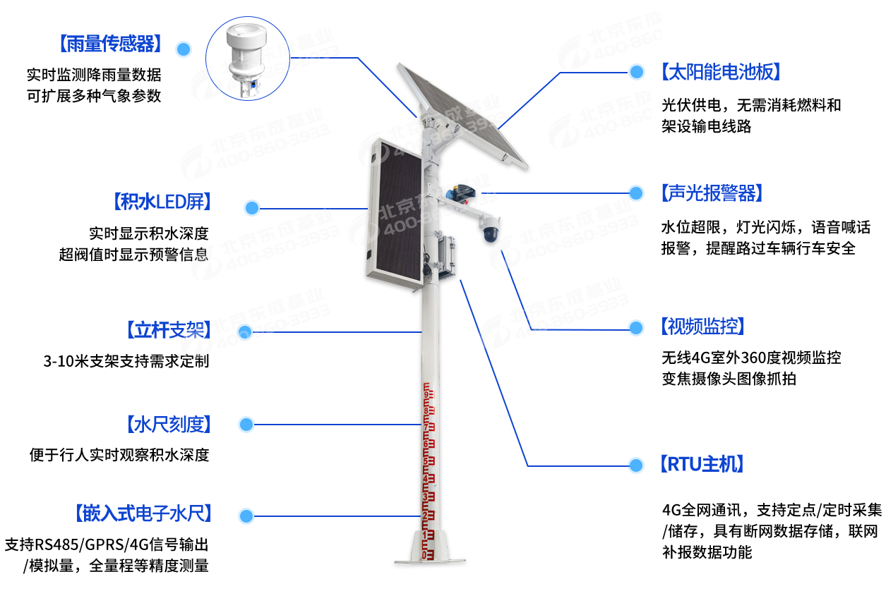 無需安裝地埋式液位計,通過立式燈桿上的水尺便可直觀觀測積水數(shù)據(jù),可因地制宜選擇4G(全網(wǎng)通)、網(wǎng)口等上傳方式。
